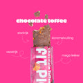 Een vanille basis, gevuld met karamel en gecoat in melkchocolade en besprenkeld met kleine stukjes toffee. Nu met 18 gram eiwit per reep!