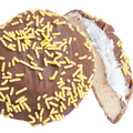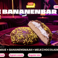 Een romige bar met bananensmaak! een lichte basis gevuld met meringue met bananensmaak. Gecoat met melkchocolade en bestrooid met gele hagelslag.