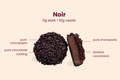 Ingredienten: Wei-eiwit concentraat, tapioca vezel, suiker, cacaomassa, plantaardige olie (zonnebloem, palmpit, palm, kokos, raapzaad), bevochtigingsmiddelen: glycerol, cacaoboter, cacao, tarwebloem, amandelen, watervrij melkvet, hazelnoten, volle melkpoeder, boterconcentraat, magere melkpoeder, emulgator: lecithine (soja, zonnebloem, raapzaad), vetarm cacaopoeder, glucosestroop, maïszetmeel, kleurstof: karamel, zout, gerstemoutextract, aroma's.